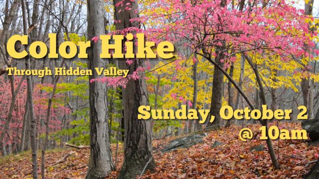 Start the season with an autumnal color hike, where we’ll look for the full rainbow of fall foliage. Be prepared for a moderately difficult hike through Hidden Valley. Wear appropriate hiking footwear, bring sun protection, bug spray, water, and a snack.