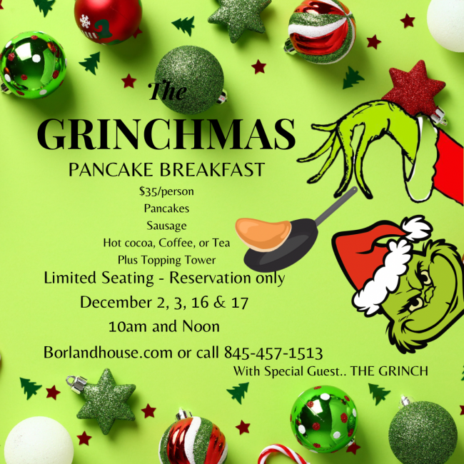 Happy holidays from the Borland House! We will be hosting our first ever Christmas brunch with special guest the Grinch! Two weekends available to bring in the Christmas cheer!